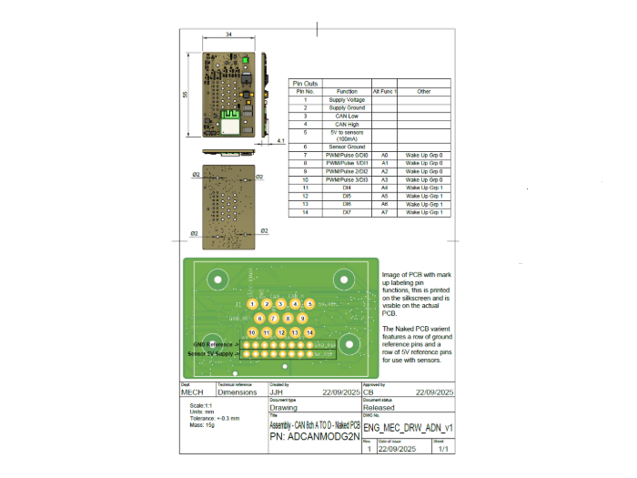 자동차용 IP67 견고한 케이스 및 커넥터를 사용하면 열악한 환경에서 사용할 수 있으며, A-D CAN 모듈은 케이스나 커넥터 없이 사용할 수 있으며 플라잉 리드를 보드에 직접 납땜할 수 있는 핀 헤더 구멍이 있습니다.
