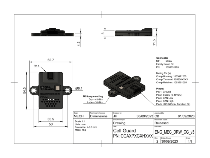 Cell Guard 센서는 ISO7637-2 2011, ISO 16750-2 2012 및 ISO 16750-4 2010을 포함한 자동차 표준에 따라 엄격한 테스트를 거쳤습니다.