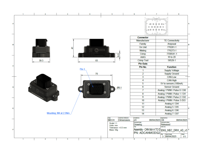 자동차용 IP67 견고한 케이스 및 커넥터를 사용하면 열악한 환경에서 사용할 수 있으며, A-D CAN 모듈은 케이스나 커넥터 없이 사용할 수 있으며 플라잉 리드를 보드에 직접 납땜할 수 있는 핀 헤더 구멍이 있습니다.